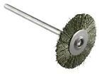 SteelPendant Wheel with numerous fine brass bristles (all the same length). Used in conjunction with the pendant motor, hobby drill or micromotor, this wheel is employed to give an even, shiny, satin finish to the surface (either as a finished surface or to give a clean area to which to solder). Size: Has a mandrel…